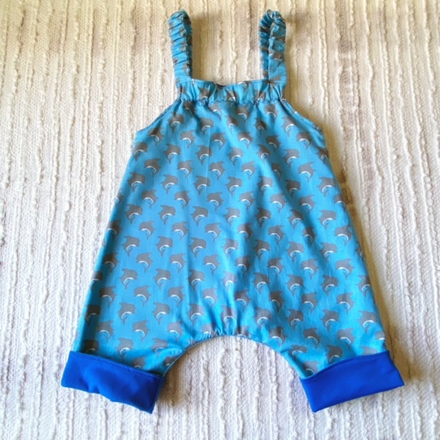 Jumpsuit-Latzhose zum Wenden mi coolem Design. Dieses Kleidungsstück garantiert in der Sommerhitze, dass sich dein Baby pudelwohl fühlt. Die hautsympatische Baumwolle macht die Latzhose angenehm zu tragen. Die Latzhose kann man wenden und so hat man “zwei Kleidungsstücke” anstatt einem. Die gemusterte Seit besteht aus 100% Baumwolle – Webware und die zweite unifarbene aus Jersey.